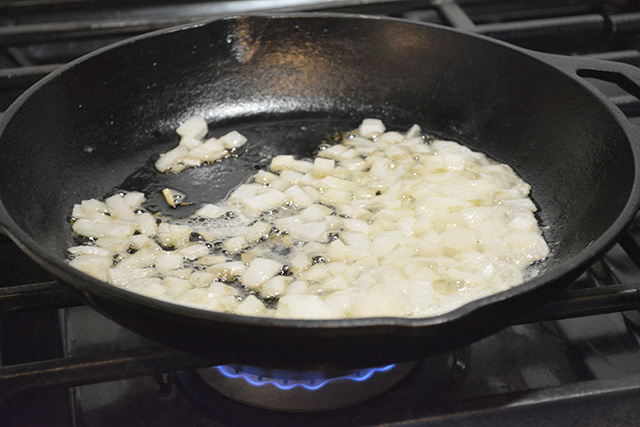 - In a 12" cast iron skillet, melt the butter. Saute the chopped onion on medium-low. Stir occasionally.