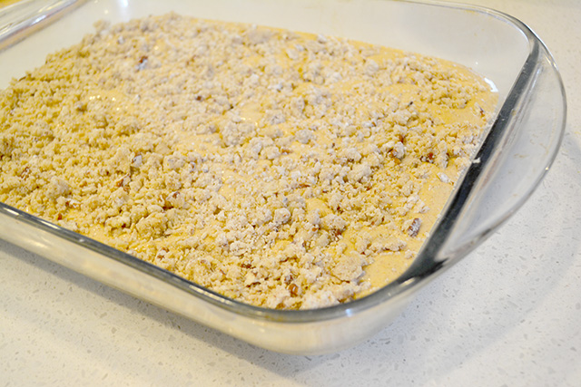 - To make the crust, cream together the brown sugar and butter. Once they are combined add in the pumpkin pie spice. Gently add in the Bisquick and nuts until mixture is crumbly. Reserve two cups. Press remaining mixture in pan with fingers. Bake 10 minutes.