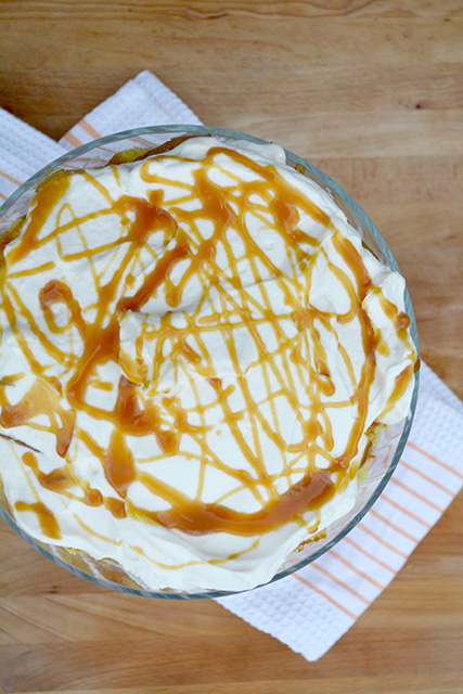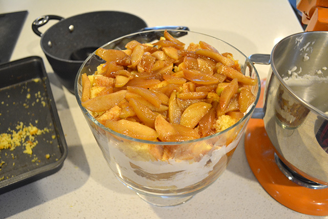 - To assemble the trifle, put down a layer of the cake pieces in your trifle dish, 1/3 of the cake. Then layer 1/3 of the the apples and then 1/3 of the whipped cream. If you are adding caramel sauce add it after the whipped cream.