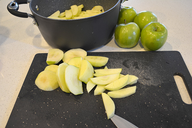 - Peel and core all apples and cut into thin wedges. In a medium sized pot on medium-low, add apples water, sugars, cinnamon and nutmeg. Mix thoroughly to coat all of the apples. Stir occasionally to keep the apples from sticking to the pot. Once the apples are fork tender and the syrup is thickening, approximately 15-20 minutes, remove from heat and let completely cool.