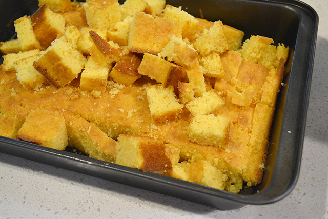 - Bake the cake according to package directions, let cool completely. Once the cake is cool, cut it into 1" square pieces.