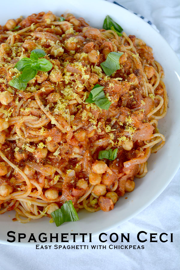 Easy Spaghetti with Chickpeas- a simple dinner made up with pantry staples. The chickpeas make the sauce extra flavorful & give it a wonderful texture.