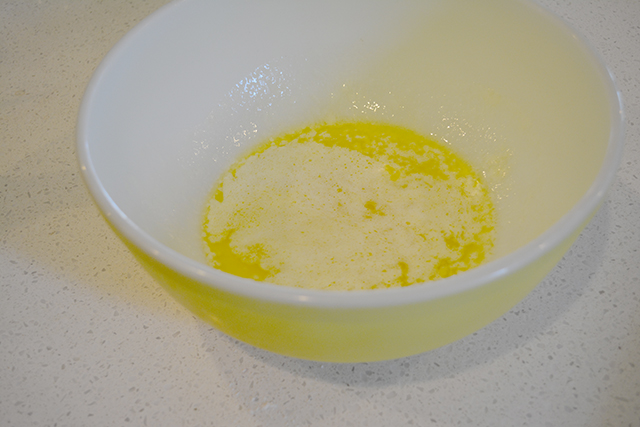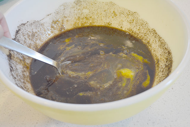 - Add the brown sugar, ground coffee, and salt to the melted butter; mix well.