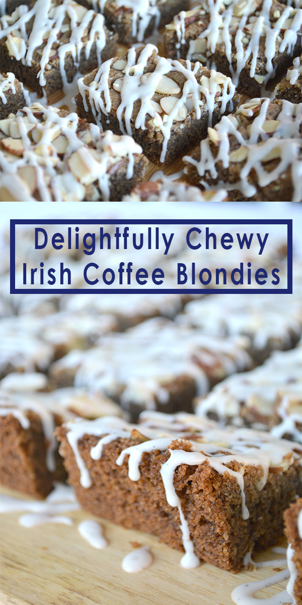 These chewy Irish Coffee Blondies are perfect for St. Patrick's Day. They have a great texture and are loaded up with coffee and whiskey. Enjoy!
