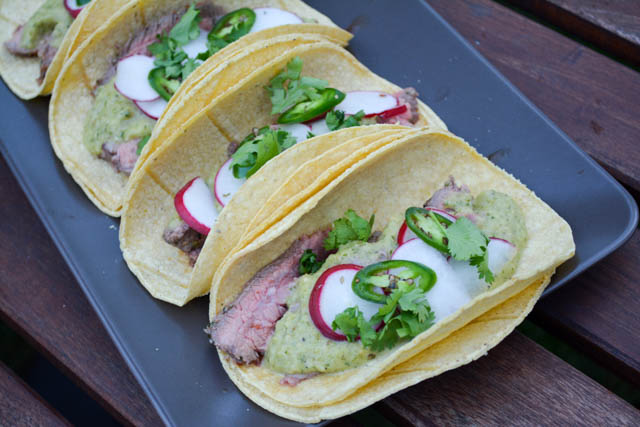 - To assemble the tacos, stack 2 tortillas on a plate, lay a few pieces of steak in the middle, then top with salsa, radishes, jalapenos, and cilantro. Squeeze lime wedges on the tacos right before eating.