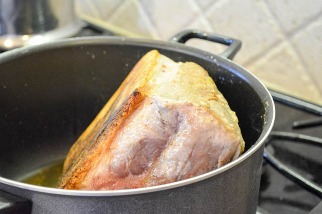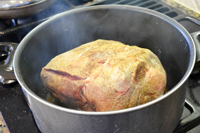 - Add the pork butt and brown the sides, turning every few minutes to brown all the sides. This can take 15-20 minutes.