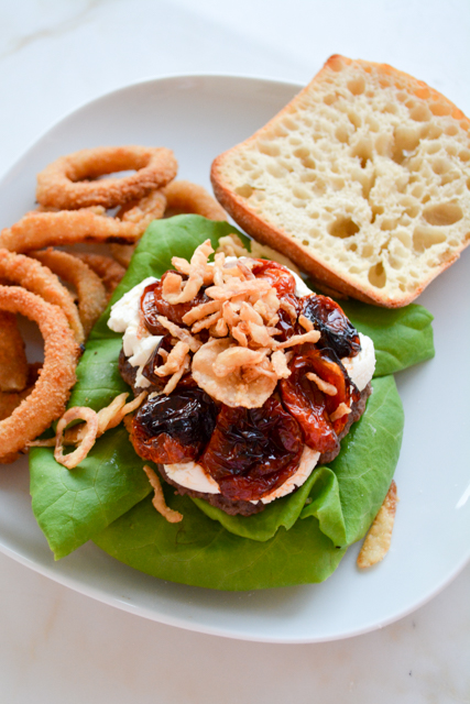 I decided on making this burger while I was doing my last Whole30, so I then spent the rest of the time dreaming about this burger. The ciabatta… oh my! The goat cheese… yes please! The roasted tomatoes… bliss. All of it is so good.