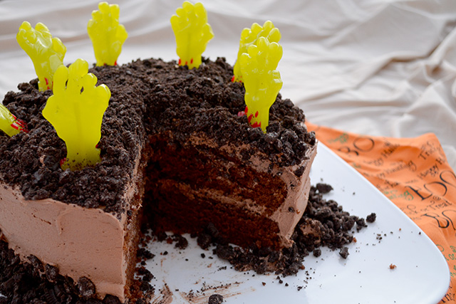 - Cover the top of the cake with 2/3 of the crushed Oreos and sprinkle the remaining crushed Oreos around the bottom of the cake. Stick the zombie hands into the top of the cake.