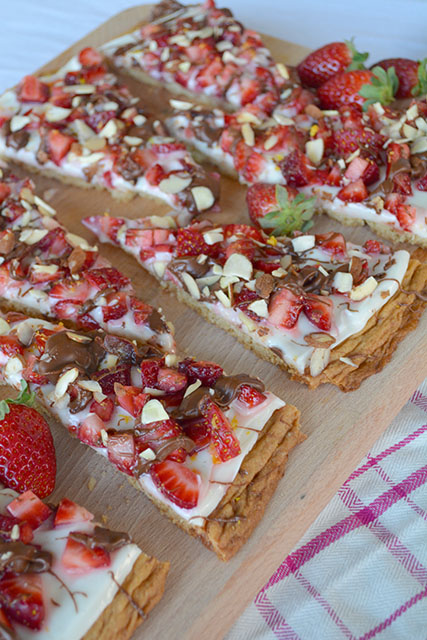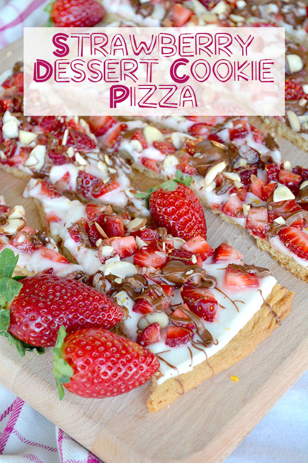 My Strawberry Dessert Cookie Pizza uses sugar cookie dough that is baked up for the pizza crust. Then apply a liberal helping of cream cheese frosting. Next, I load it up with freshly cut strawberries, Nutella, and slivered almonds. The finishing touch is a wee bit of lemon zest to give it a bit of pazazz.