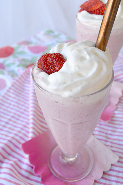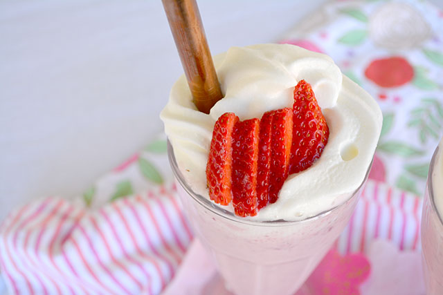 Blend up your milkshake, then top it off with a generous amount of whipped cream for the perfect finishing touch. You’ll just need to insert a big straw to be on your way to enjoying The Best Homemade Strawberry Milkshakes.