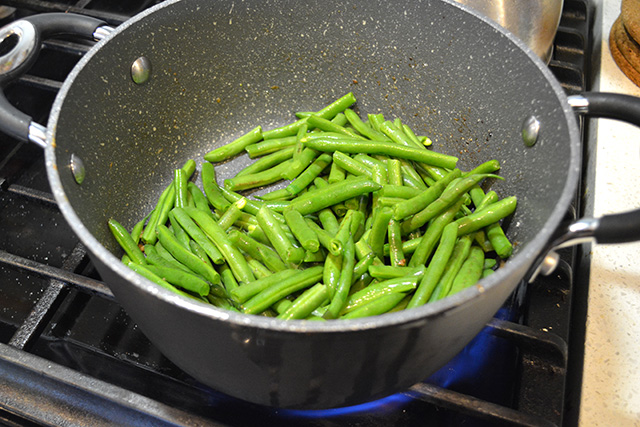 - Add the string beans to the skillet with the oil. Cook for about 4-5 minutes until the string beans are blistered and soft. Stir often.
