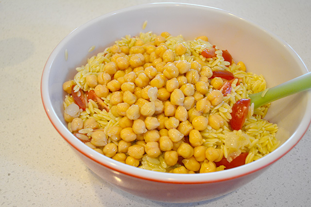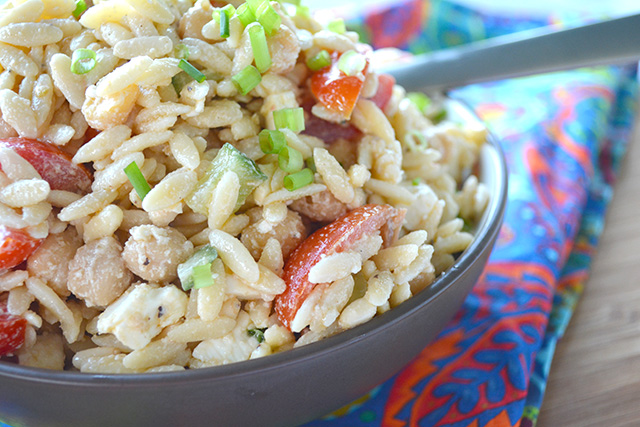 Plus, the Orzo’s shape lends itself well to take on the dressing, so it is evenly coated. The small size also means it’s similar to the chickpeas and the grape tomatoes- making it easy to eat.