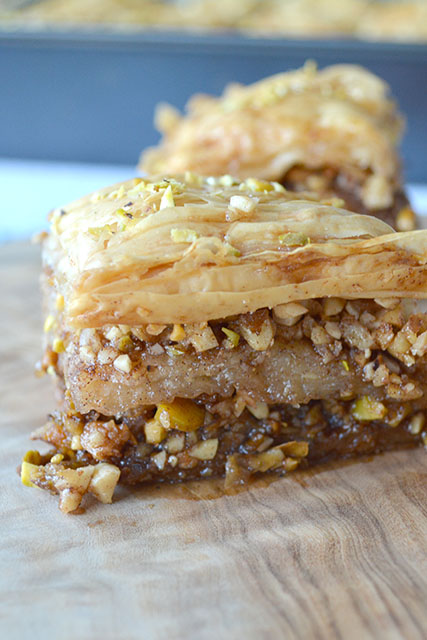 When it’s done baking, the crisp golden phyllo dough layers then soak up the sweet honey syrup, making it so delicious.