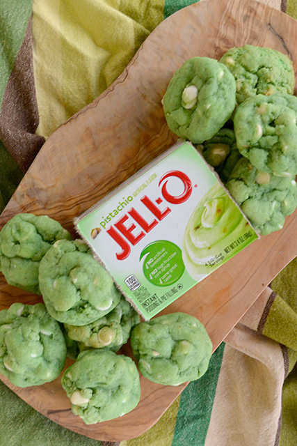 Like your typical chocolate chip cookie recipe, there is butter, granulated sugar, brown sugar, flour, salt, and chocolate chips. This recipe features pistachio pudding mix and white chocolate chips. The addition of a few drops of green food coloring helps give the cookies a brighter green color.
