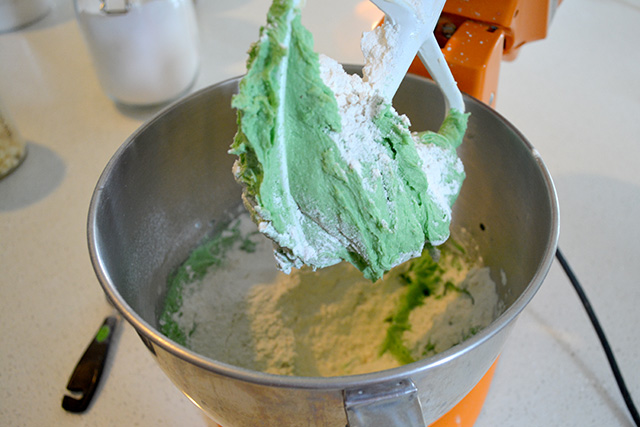 - In the bowl of a stand mixer fitted with a paddle attachment, cream together the butter and sugars until light and fluffy. Add in pudding and beat until well blended. Beat in the eggs, vanilla, extract, green food coloring mix again.