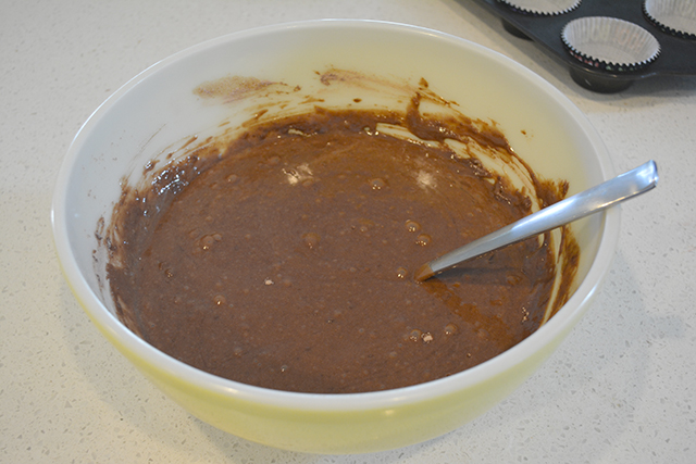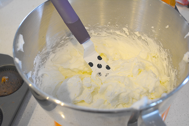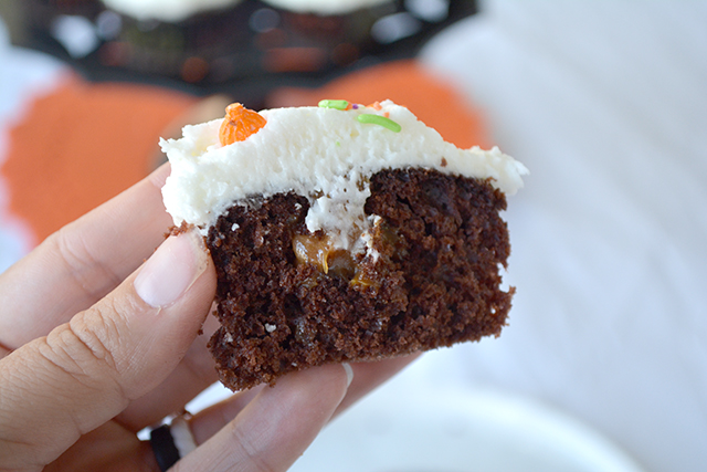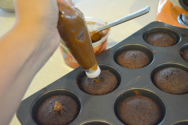 Once the cupcakes are baked and cooled, you fill them with some yummy caramel dip from Litehouse Foods. It’s the perfect consistency for the filling of the cupcakes.