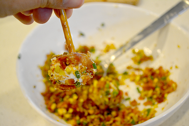 You’ll love that you just need bacon, cream cheese, Ranch seasoning, pecans, shredded cheddar cheese, and chives for the cheese balls. Then you serve them with pretzel sticks!