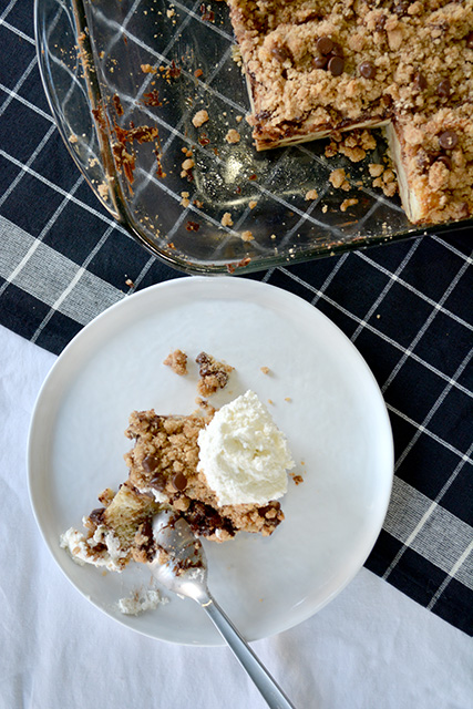 The crumbly topping is just made with some flour, brown sugar, cinnamon, and butter. It will seem like a lot but it is the right amount. You want a lot of big crumbs on top!