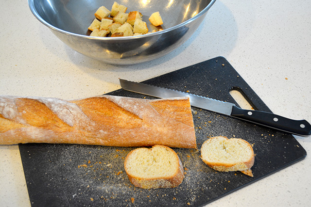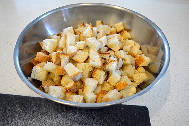 - Cube the bread into 1" pieces. Place in a very large mixing bowl.