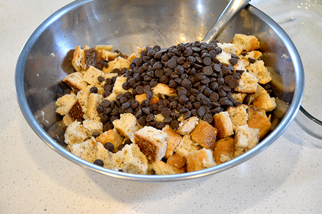 - Mix in the chocolate chips, then transfer the bread pudding to a buttered 9x13 pan.