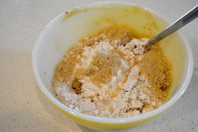 - To make the topping, combine the butter, flour, sugars, and cinnamon.