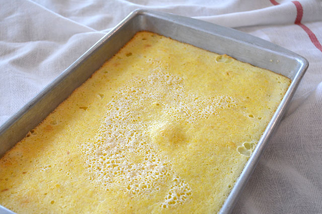 Since my baking supplies are in transit now, I just grabbed a pan out of my dad’s pantry which happened to be a rectangle but the surface area was comparable to a a 8×8 pan. So before you look at this and thing “yo lady, that’s not a square pan…” I know, I know. But it worked, I swear. You can also switch it to be a 9″ round pan but cutting out 20 even slices could be tricky.
